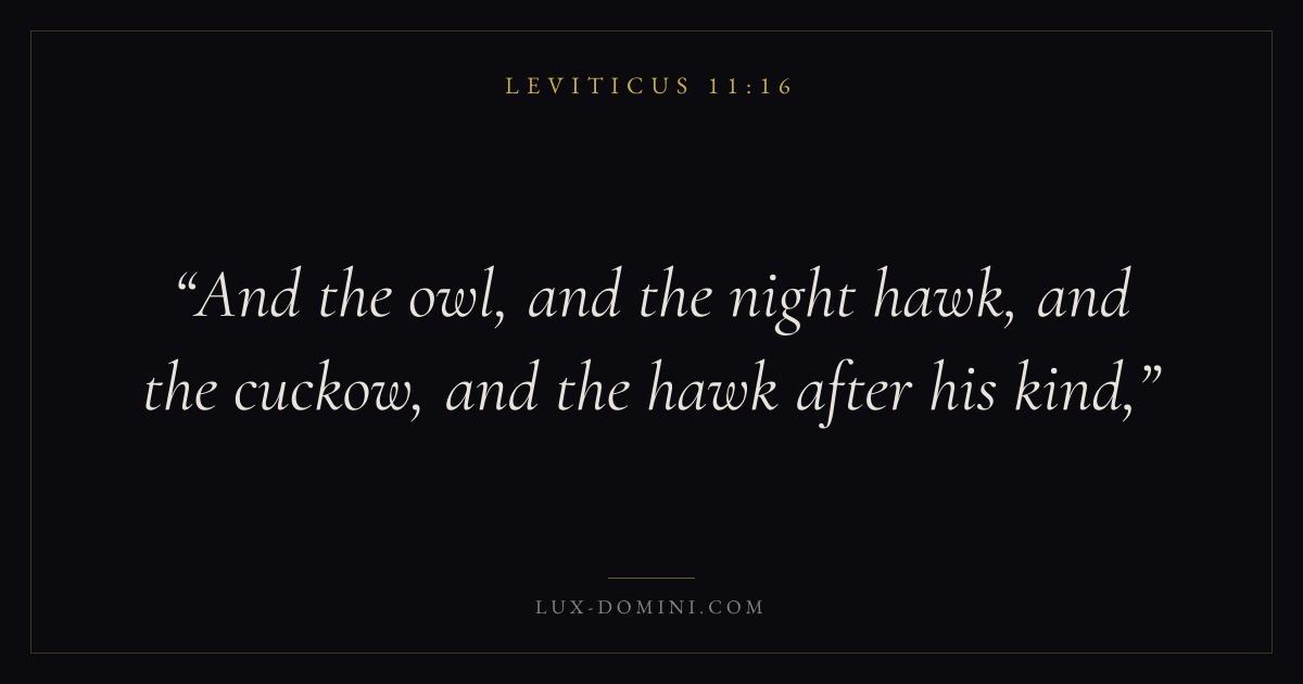 Books / Leviticus / Chapter 11 / Verse 16 ← Leviticus 11:15 Leviticus 11:16 Leviticus 11:17 → And the owl, and the night hawk, and the cuckow, and the hawk after his kind, Download verse card Share on Twitter Share on Facebook Pin it ✦ Key themes HolinessAtonementPriesthoodSacrifice Read with Leviticus 11:13Leviticus 11:14 ✦ Leviticus Chapter 11 verses V. 1 V. 2 V. 3 V. 4 V. 5 V. 6 V. 7 V. 8 V. 9 V. 10 V. 11 V. 12 V. 13 V. 14 V. 15 V. 16 V. 17 V. 18 V. 19 V. 20 V. 21 V. 22 V. 23 V. 24 V. 25 V. 26 V. 27 V. 28 V. 29 V. 30 V. 31 V. 32 V. 33 V. 34 V. 35 V. 36 V. 37 V. 38 V. 39 V. 40 V. 41 V. 42 V. 43 V. 44 V. 45 V. 46 V. 47