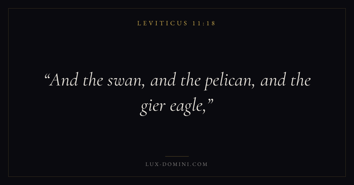 Books / Leviticus / Chapter 11 / Verse 18 ← Leviticus 11:17 Leviticus 11:18 Leviticus 11:19 → And the swan, and the pelican, and the gier eagle, Download verse card Share on Twitter Share on Facebook Pin it ✦ Key themes HolinessAtonementPriesthoodSacrifice Read with Leviticus 11:19 ✦ Leviticus Chapter 11 verses V. 1 V. 2 V. 3 V. 4 V. 5 V. 6 V. 7 V. 8 V. 9 V. 10 V. 11 V. 12 V. 13 V. 14 V. 15 V. 16 V. 17 V. 18 V. 19 V. 20 V. 21 V. 22 V. 23 V. 24 V. 25 V. 26 V. 27 V. 28 V. 29 V. 30 V. 31 V. 32 V. 33 V. 34 V. 35 V. 36 V. 37 V. 38 V. 39 V. 40 V. 41 V. 42 V. 43 V. 44 V. 45 V. 46 V. 47