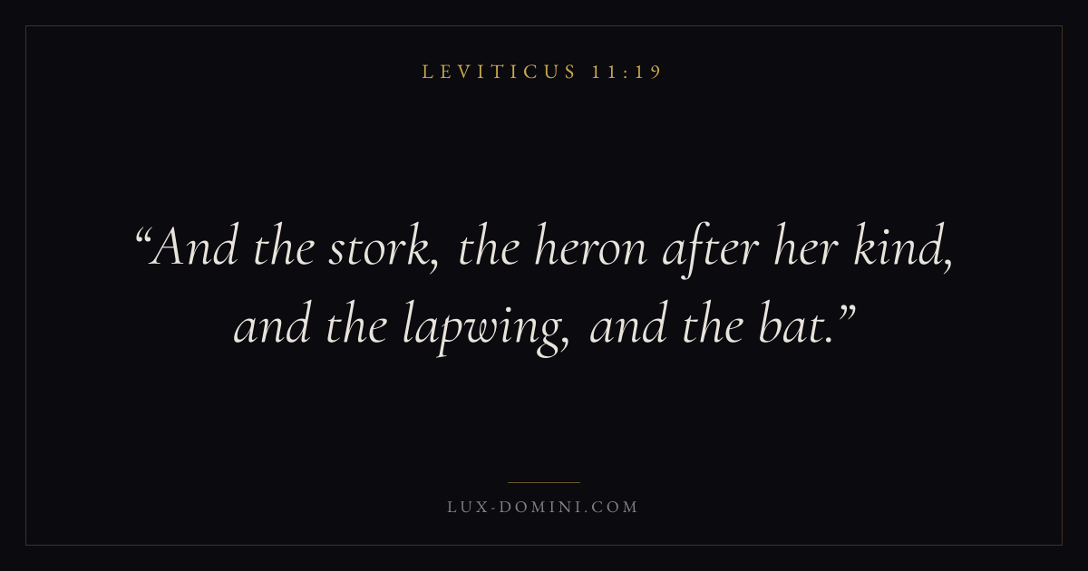 Books / Leviticus / Chapter 11 / Verse 19 ← Leviticus 11:18 Leviticus 11:19 Leviticus 11:20 → And the stork, the heron after her kind, and the lapwing, and the bat. Download verse card Share on Twitter Share on Facebook Pin it ✦ Key themes HolinessAtonementPriesthoodSacrifice Read with Leviticus 11:18 ✦ Leviticus Chapter 11 verses V. 1 V. 2 V. 3 V. 4 V. 5 V. 6 V. 7 V. 8 V. 9 V. 10 V. 11 V. 12 V. 13 V. 14 V. 15 V. 16 V. 17 V. 18 V. 19 V. 20 V. 21 V. 22 V. 23 V. 24 V. 25 V. 26 V. 27 V. 28 V. 29 V. 30 V. 31 V. 32 V. 33 V. 34 V. 35 V. 36 V. 37 V. 38 V. 39 V. 40 V. 41 V. 42 V. 43 V. 44 V. 45 V. 46 V. 47