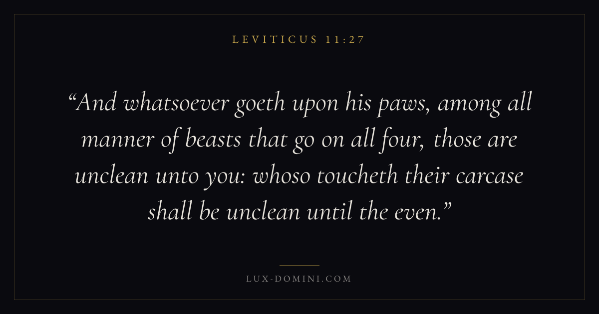 And whatsoever goeth upon his paws, among all manner of beasts that go on all four, those are unclean unto you: whoso toucheth their carcase shall be unclean until the even.