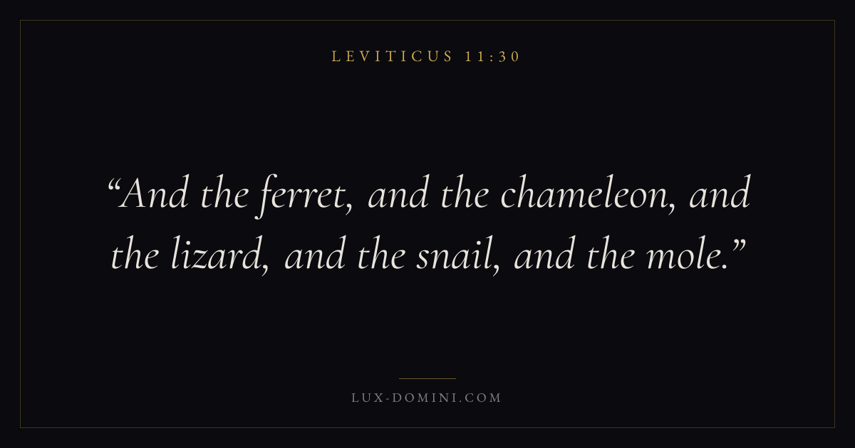 Books / Leviticus / Chapter 11 / Verse 30 ← Leviticus 11:29 Leviticus 11:30 Leviticus 11:31 → And the ferret, and the chameleon, and the lizard, and the snail, and the mole. Download verse card Share on Twitter Share on Facebook Pin it ✦ Key themes HolinessAtonementPriesthoodSacrifice Read with Leviticus 11:29 ✦ Leviticus Chapter 11 verses V. 1 V. 2 V. 3 V. 4 V. 5 V. 6 V. 7 V. 8 V. 9 V. 10 V. 11 V. 12 V. 13 V. 14 V. 15 V. 16 V. 17 V. 18 V. 19 V. 20 V. 21 V. 22 V. 23 V. 24 V. 25 V. 26 V. 27 V. 28 V. 29 V. 30 V. 31 V. 32 V. 33 V. 34 V. 35 V. 36 V. 37 V. 38 V. 39 V. 40 V. 41 V. 42 V. 43 V. 44 V. 45 V. 46 V. 47
