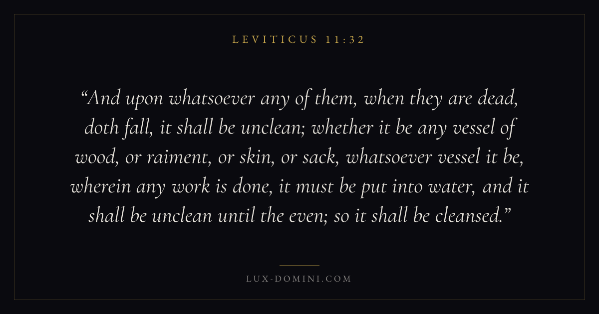 And upon whatsoever any of them, when they are dead, doth fall, it shall be unclean; whether it be any vessel of wood, or raiment, or skin, or sack, whatsoever vessel it be, wherein any work is done, it must be put into water, and it shall be unclean until the even; so it shall be cleansed.