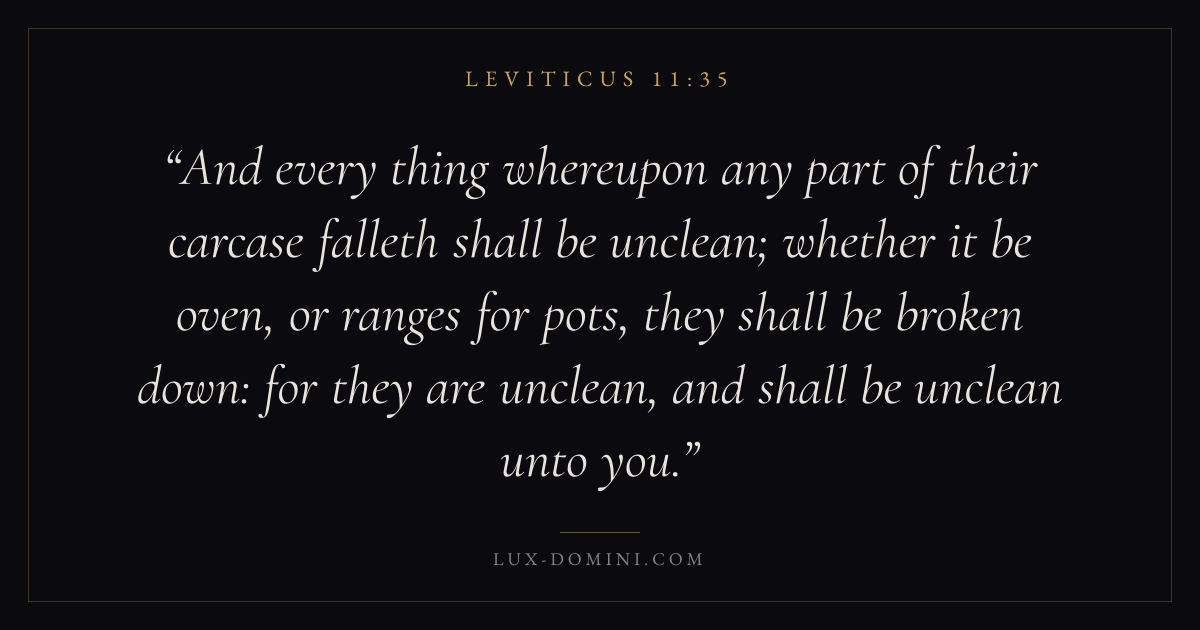 And every thing whereupon any part of their carcase falleth shall be unclean; whether it be oven, or ranges for pots, they shall be broken down: for they are unclean, and shall be unclean unto you.