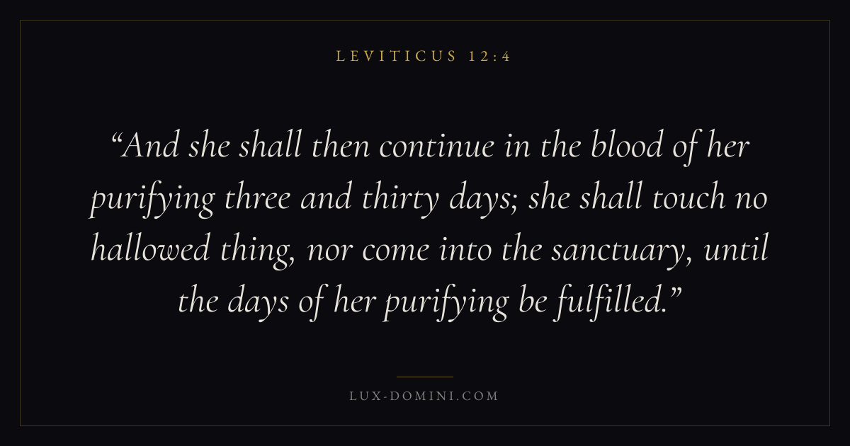 And she shall then continue in the blood of her purifying three and thirty days; she shall touch no hallowed thing, nor come into the sanctuary, until the days of her purifying be fulfilled.