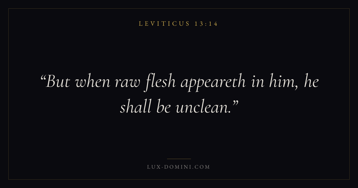 Books / Leviticus / Chapter 13 / Verse 14 ← Leviticus 13:13 Leviticus 13:14 Leviticus 13:15 → But when raw flesh appeareth in him, he shall be unclean. Download verse card Share on Twitter Share on Facebook Pin it ✦ Key themes HolinessAtonementPriesthoodSacrifice Read with Leviticus 13:15Leviticus 13:16 ✦ Leviticus Chapter 13 verses V. 1 V. 2 V. 3 V. 4 V. 5 V. 6 V. 7 V. 8 V. 9 V. 10 V. 11 V. 12 V. 13 V. 14 V. 15 V. 16 V. 17 V. 18 V. 19 V. 20 V. 21 V. 22 V. 23 V. 24 V. 25 V. 26 V. 27 V. 28 V. 29 V. 30 V. 31 V. 32 V. 33 V. 34 V. 35 V. 36 V. 37 V. 38 V. 39 V. 40 V. 41 V. 42 V. 43 V. 44 V. 45 V. 46 V. 47 V. 48 V. 49 V. 50 V. 51 V. 52 V. 53 V. 54 V. 55 V. 56 V. 57 V. 58 V. 59