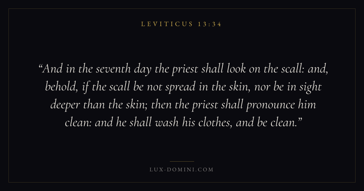 And in the seventh day the priest shall look on the scall: and, behold, if the scall be not spread in the skin, nor be in sight deeper than the skin; then the priest shall pronounce him clean: and he shall wash his clothes, and be clean.