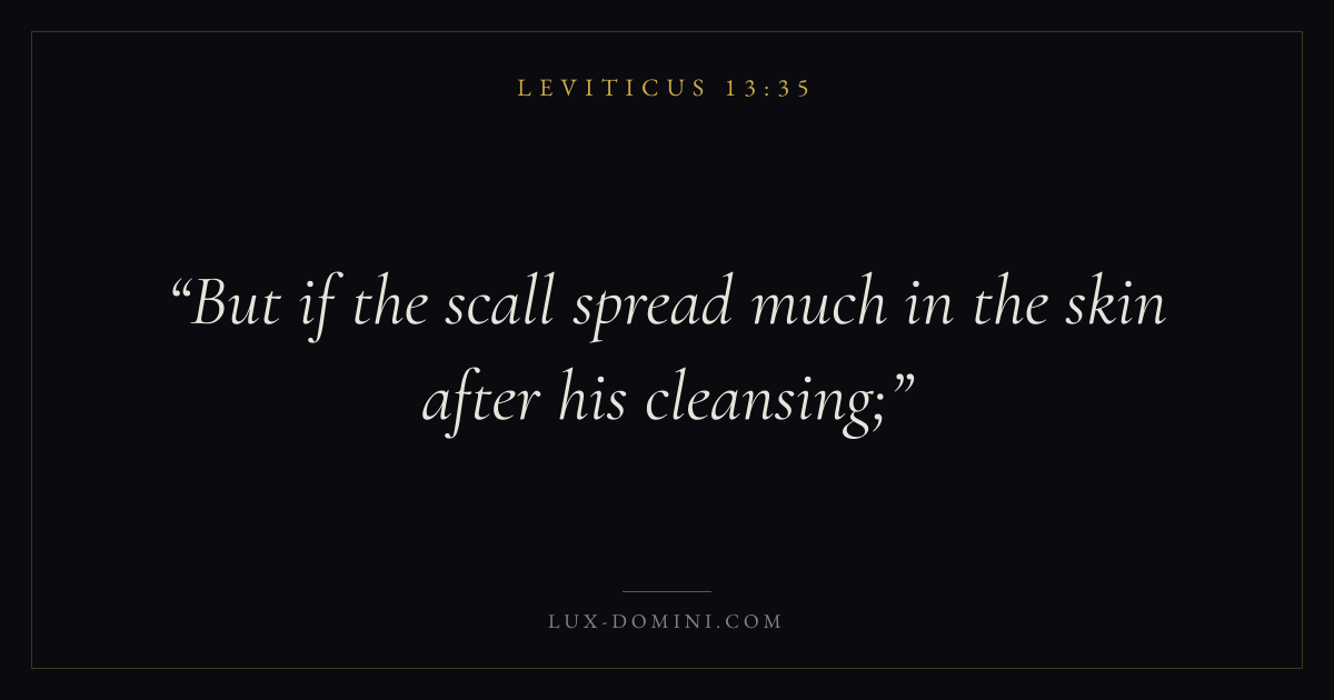 Books / Leviticus / Chapter 13 / Verse 35 ← Leviticus 13:34 Leviticus 13:35 Leviticus 13:36 → But if the scall spread much in the skin after his cleansing; Download verse card Share on Twitter Share on Facebook Pin it ✦ Key themes Justice and mercyHolinessAtonementPriesthood Read with Leviticus 13:34Leviticus 13:36Micah 6:8Amos 5:24 Related topics Bible verses about justice and mercy ✦ Leviticus Chapter 13 verses V. 1 V. 2 V. 3 V. 4 V. 5 V. 6 V. 7 V. 8 V. 9 V. 10 V. 11 V. 12 V. 13 V. 14 V. 15 V. 16 V. 17 V. 18 V. 19 V. 20 V. 21 V. 22 V. 23 V. 24 V. 25 V. 26 V. 27 V. 28 V. 29 V. 30 V. 31 V. 32 V. 33 V. 34 V. 35 V. 36 V. 37 V. 38 V. 39 V. 40 V. 41 V. 42 V. 43 V. 44 V. 45 V. 46 V. 47 V. 48 V. 49 V. 50 V. 51 V. 52 V. 53 V. 54 V. 55 V. 56 V. 57 V. 58 V. 59