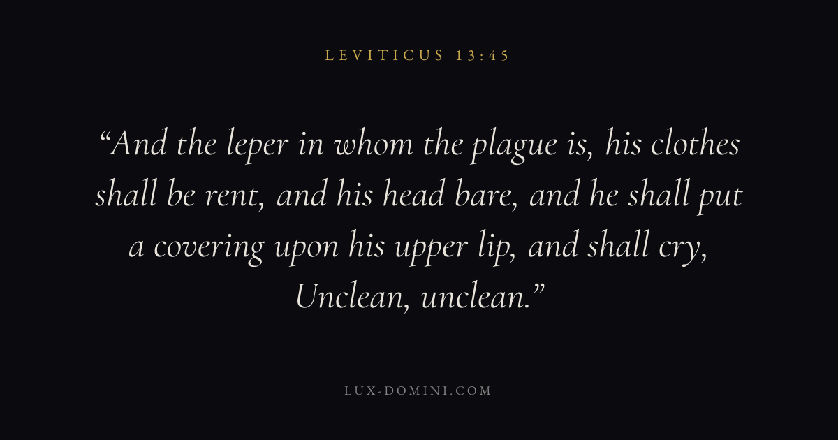 And the leper in whom the plague is, his clothes shall be rent, and his head bare, and he shall put a covering upon his upper lip, and shall cry, Unclean, unclean.