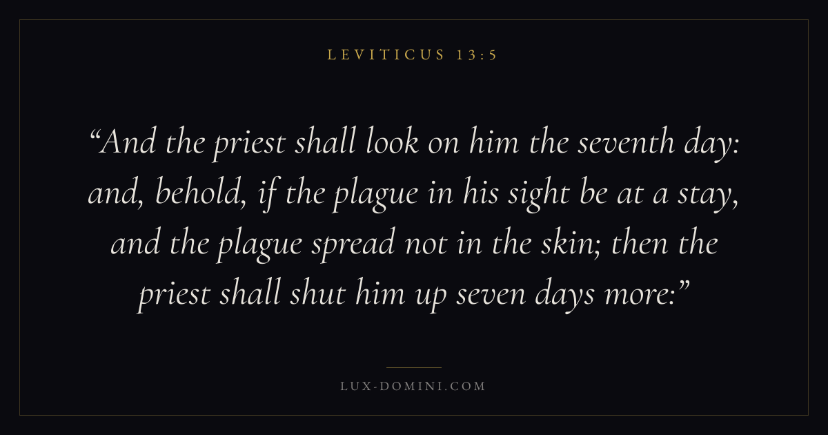 And the priest shall look on him the seventh day: and, behold, if the plague in his sight be at a stay, and the plague spread not in the skin; then the priest shall shut him up seven days more: