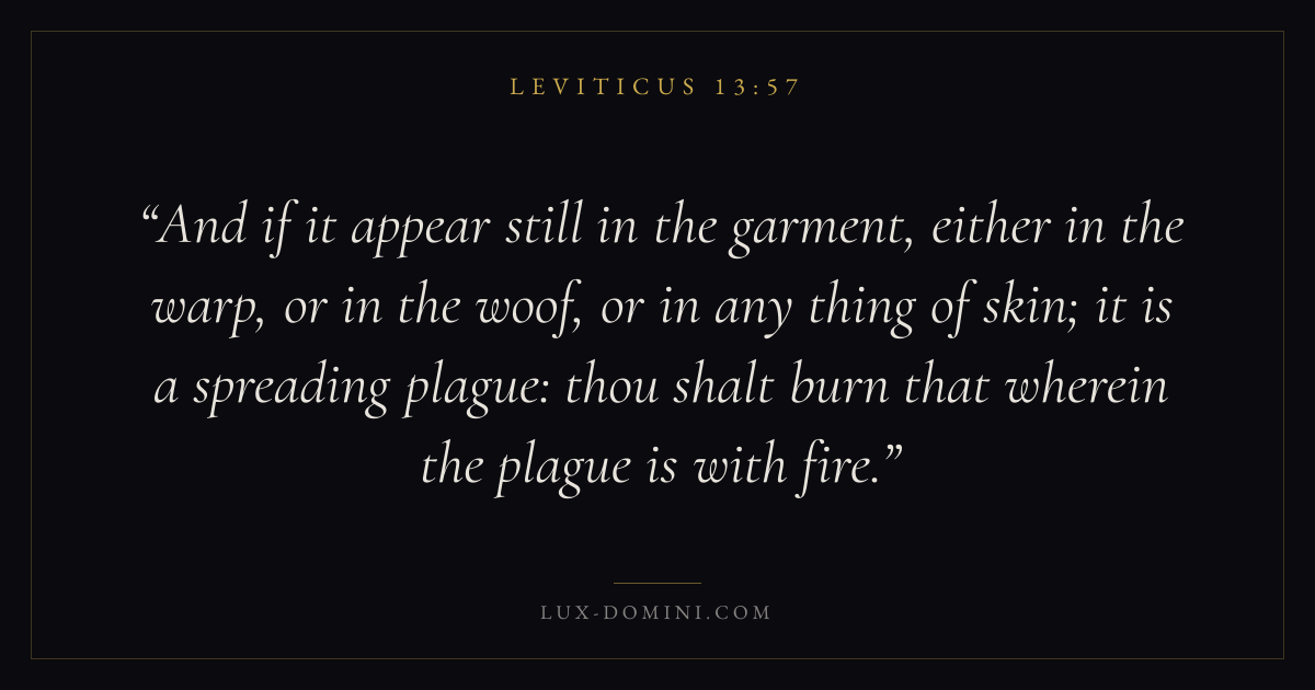 And if it appear still in the garment, either in the warp, or in the woof, or in any thing of skin; it is a spreading plague: thou shalt burn that wherein the plague is with fire.
