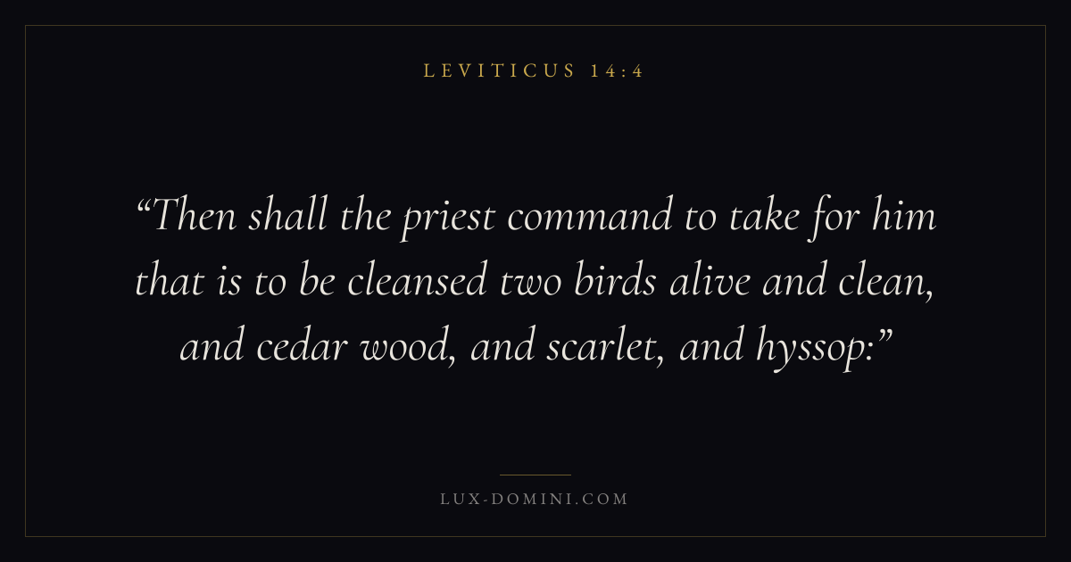 Then shall the priest command to take for him that is to be cleansed two birds alive and clean, and cedar wood, and scarlet, and hyssop: