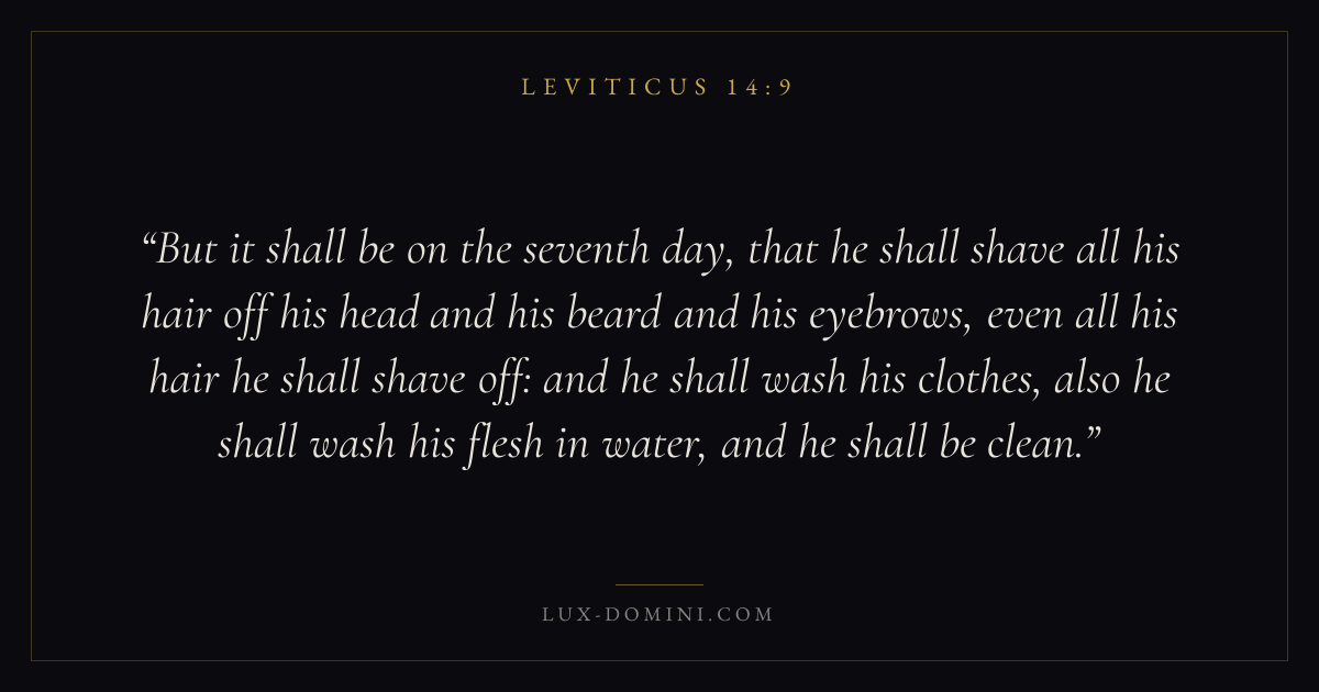 But it shall be on the seventh day, that he shall shave all his hair off his head and his beard and his eyebrows, even all his hair he shall shave off: and he shall wash his clothes, also he shall wash his flesh in water, and he shall be clean.