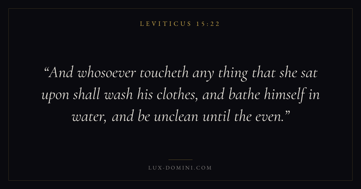 And whosoever toucheth any thing that she sat upon shall wash his clothes, and bathe himself in water, and be unclean until the even.