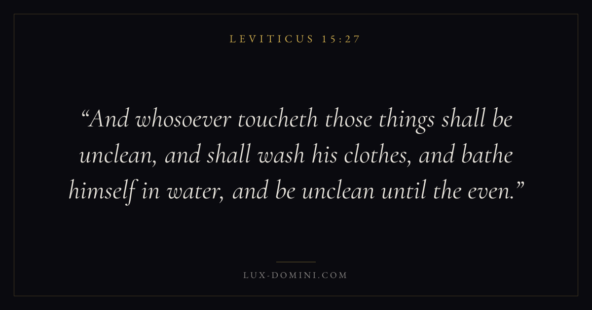 And whosoever toucheth those things shall be unclean, and shall wash his clothes, and bathe himself in water, and be unclean until the even.