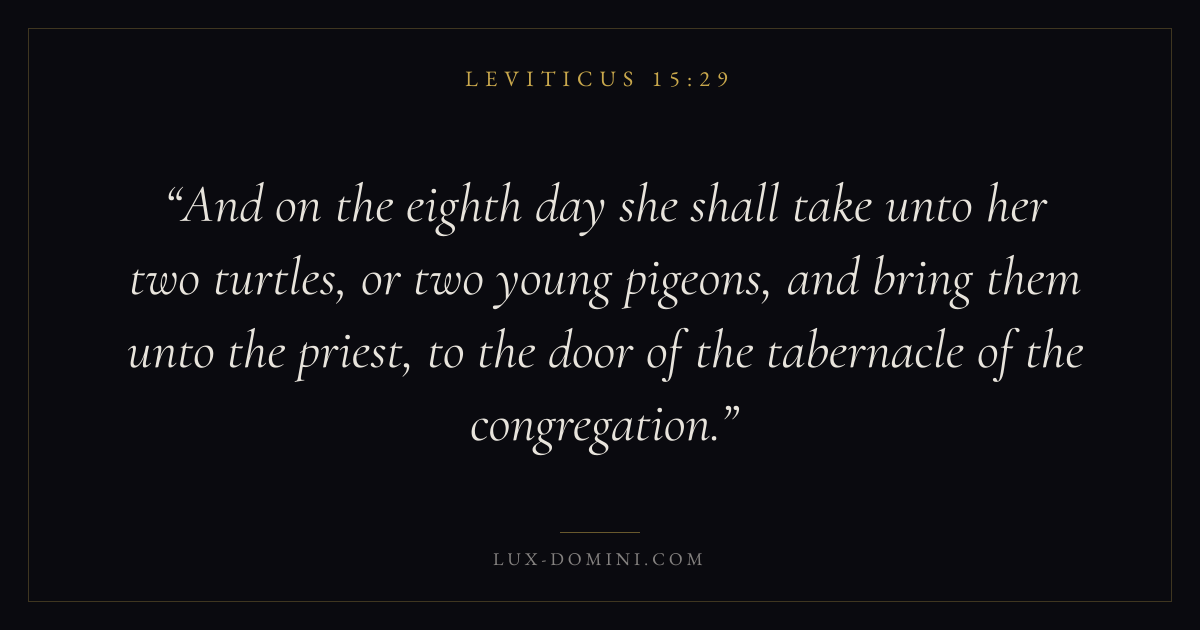 And on the eighth day she shall take unto her two turtles, or two young pigeons, and bring them unto the priest, to the door of the tabernacle of the congregation.
