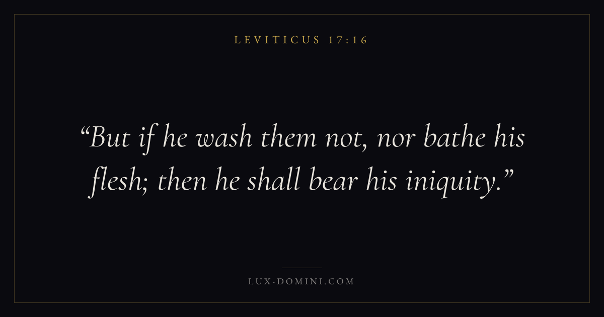 Books / Leviticus / Chapter 17 / Verse 16 ← Leviticus 17:15 Leviticus 17:16 Leviticus 18:1 → But if he wash them not, nor bathe his flesh; then he shall bear his iniquity. Download verse card Share on Twitter Share on Facebook Pin it ✦ Key themes HolinessAtonementPriesthoodSacrifice Read with Leviticus 17:15 ✦ Leviticus Chapter 17 verses V. 1 V. 2 V. 3 V. 4 V. 5 V. 6 V. 7 V. 8 V. 9 V. 10 V. 11 V. 12 V. 13 V. 14 V. 15 V. 16