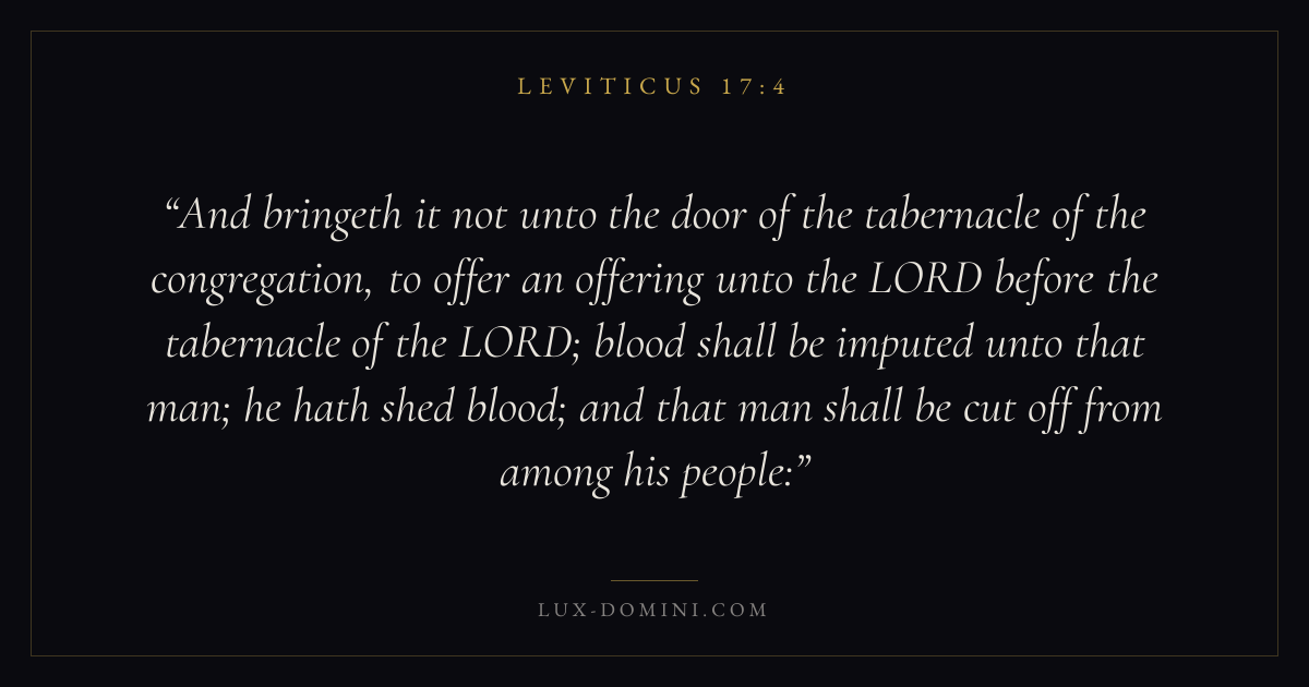 And bringeth it not unto the door of the tabernacle of the congregation, to offer an offering unto the LORD before the tabernacle of the LORD; blood shall be imputed unto that man; he hath shed blood; and that man shall be cut off from among his people: