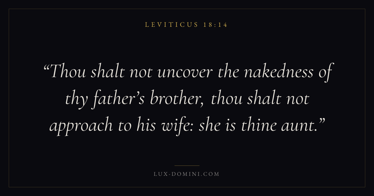Thou shalt not uncover the nakedness of thy father’s brother, thou shalt not approach to his wife: she is thine aunt.