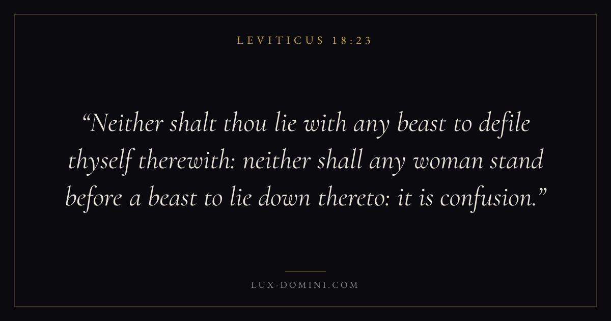 Neither shalt thou lie with any beast to defile thyself therewith: neither shall any woman stand before a beast to lie down thereto: it is confusion.