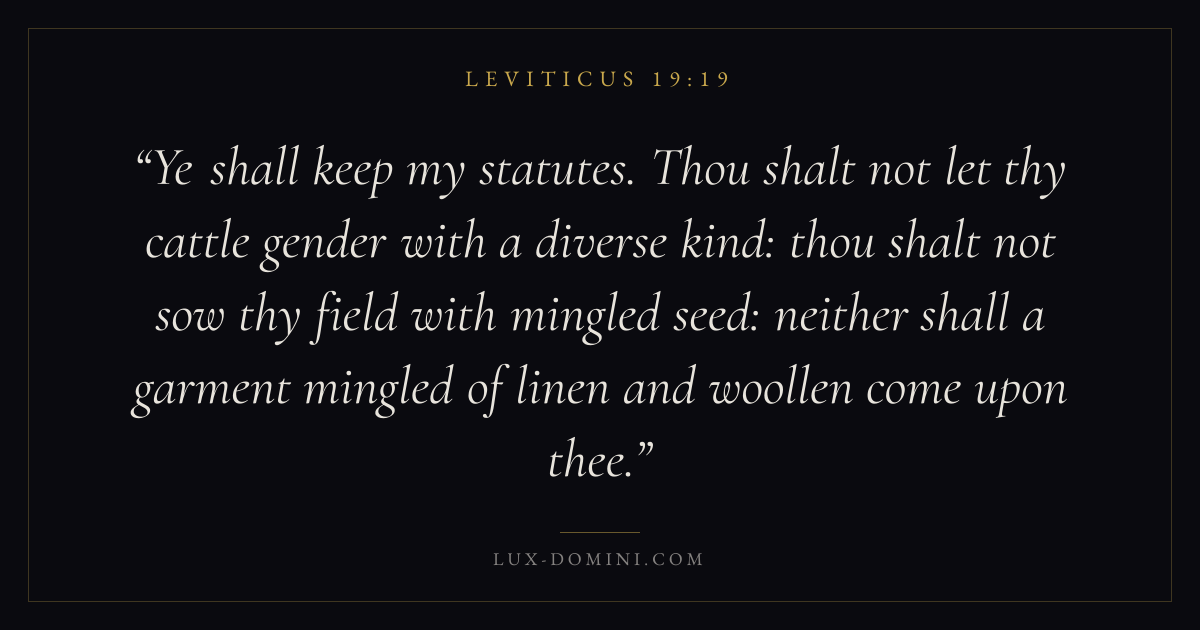 Ye shall keep my statutes. Thou shalt not let thy cattle gender with a diverse kind: thou shalt not sow thy field with mingled seed: neither shall a garment mingled of linen and woollen come upon thee.