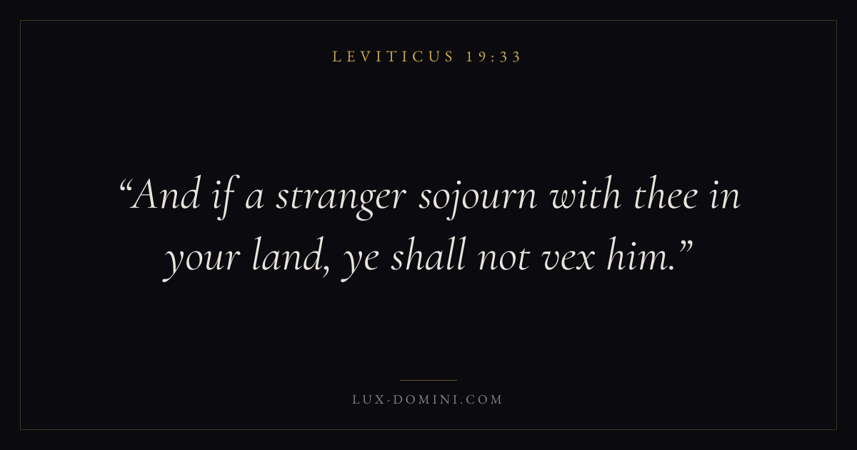 Books / Leviticus / Chapter 19 / Verse 33 ← Leviticus 19:32 Leviticus 19:33 Leviticus 19:34 → And if a stranger sojourn with thee in your land, ye shall not vex him. Download verse card Share on Twitter Share on Facebook Pin it ✦ Key themes HolinessAtonementPriesthoodSacrifice Read with Leviticus 19:34 ✦ Leviticus Chapter 19 verses V. 1 V. 2 V. 3 V. 4 V. 5 V. 6 V. 7 V. 8 V. 9 V. 10 V. 11 V. 12 V. 13 V. 14 V. 15 V. 16 V. 17 V. 18 V. 19 V. 20 V. 21 V. 22 V. 23 V. 24 V. 25 V. 26 V. 27 V. 28 V. 29 V. 30 V. 31 V. 32 V. 33 V. 34 V. 35 V. 36 V. 37