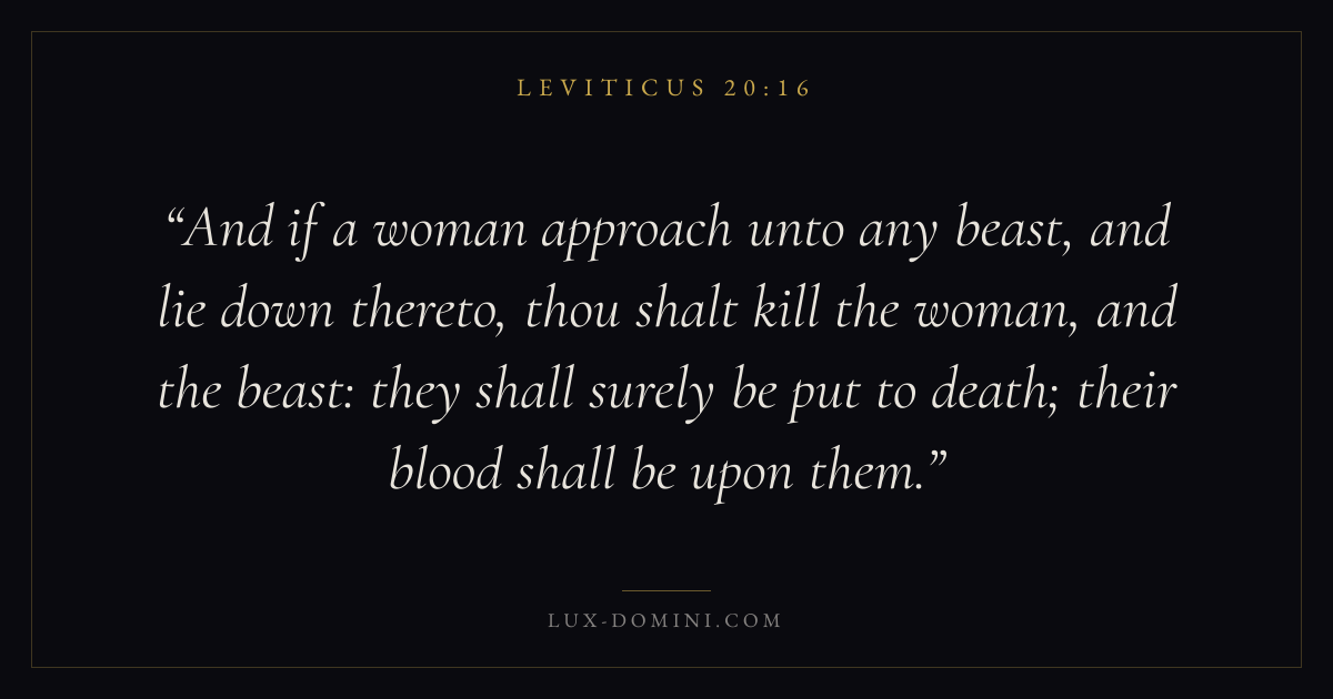 And if a woman approach unto any beast, and lie down thereto, thou shalt kill the woman, and the beast: they shall surely be put to death; their blood shall be upon them.