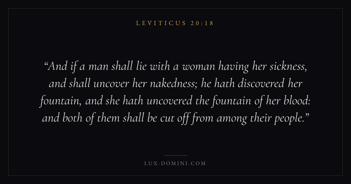 And if a man shall lie with a woman having her sickness, and shall uncover her nakedness; he hath discovered her fountain, and she hath uncovered the fountain of her blood: and both of them shall be cut off from among their people.