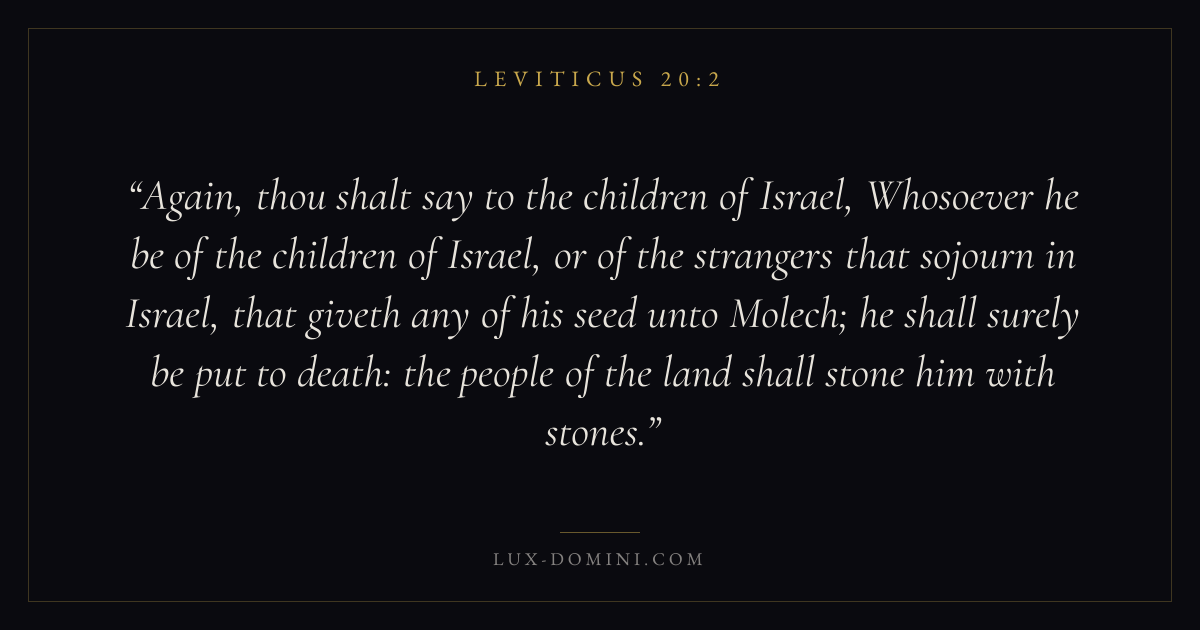 Again, thou shalt say to the children of Israel, Whosoever he be of the children of Israel, or of the strangers that sojourn in Israel, that giveth any of his seed unto Molech; he shall surely be put to death: the people of the land shall stone him with stones.