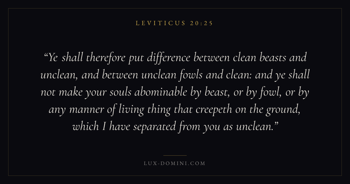 Ye shall therefore put difference between clean beasts and unclean, and between unclean fowls and clean: and ye shall not make your souls abominable by beast, or by fowl, or by any manner of living thing that creepeth on the ground, which I have separated from you as unclean.