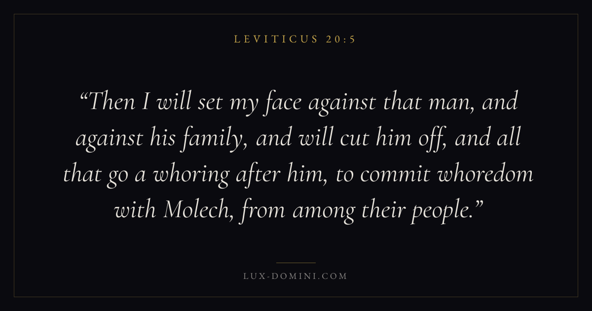 Then I will set my face against that man, and against his family, and will cut him off, and all that go a whoring after him, to commit whoredom with Molech, from among their people.