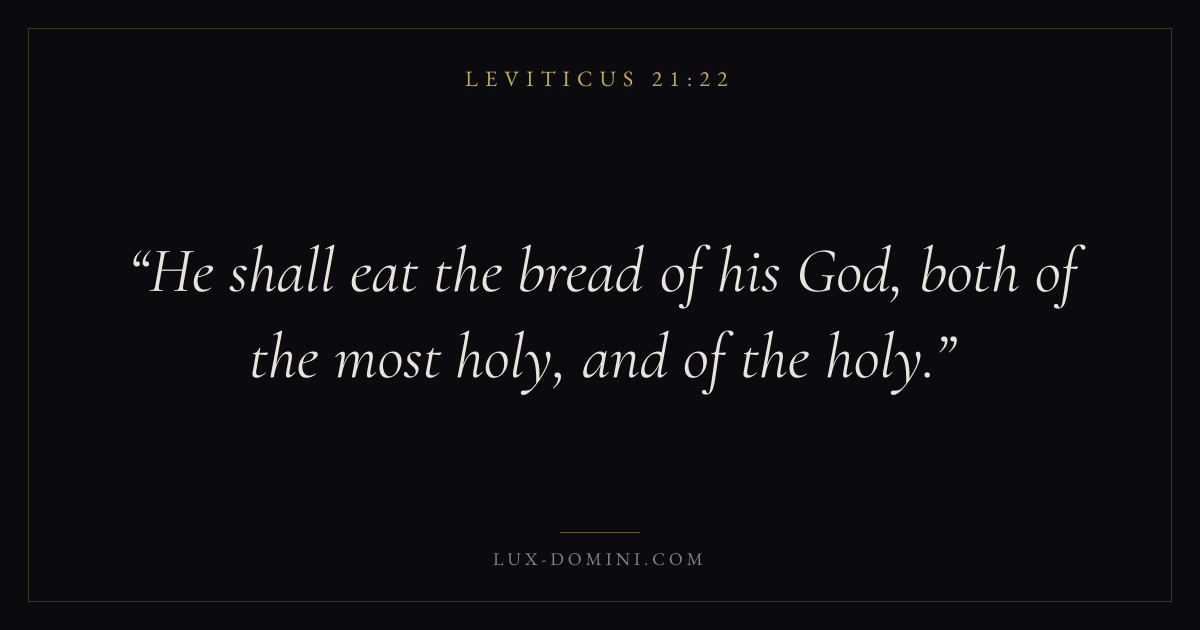 Books / Leviticus / Chapter 21 / Verse 22 ← Leviticus 21:21 Leviticus 21:22 Leviticus 21:23 → He shall eat the bread of his God, both of the most holy, and of the holy. Download verse card Share on Twitter Share on Facebook Pin it ✦ Key themes HolinessAtonementPriesthoodSacrifice Read with Leviticus 21:21 ✦ Leviticus Chapter 21 verses V. 1 V. 2 V. 3 V. 4 V. 5 V. 6 V. 7 V. 8 V. 9 V. 10 V. 11 V. 12 V. 13 V. 14 V. 15 V. 16 V. 17 V. 18 V. 19 V. 20 V. 21 V. 22 V. 23 V. 24