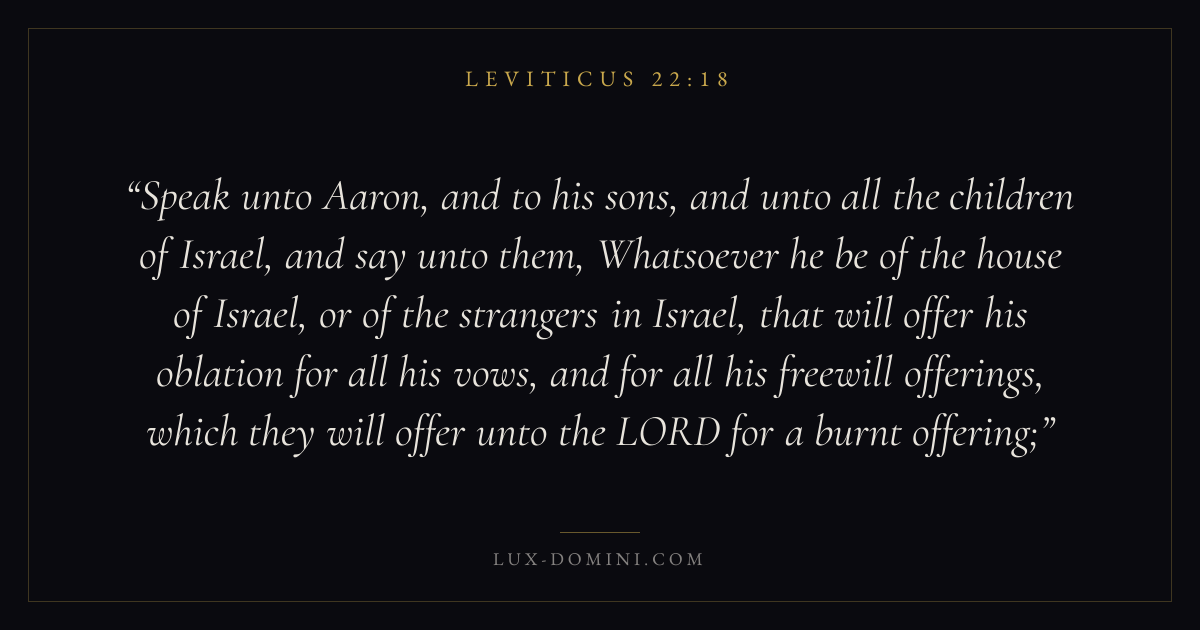 Speak unto Aaron, and to his sons, and unto all the children of Israel, and say unto them, Whatsoever he be of the house of Israel, or of the strangers in Israel, that will offer his oblation for all his vows, and for all his freewill offerings, which they will offer unto the LORD for a burnt offering;