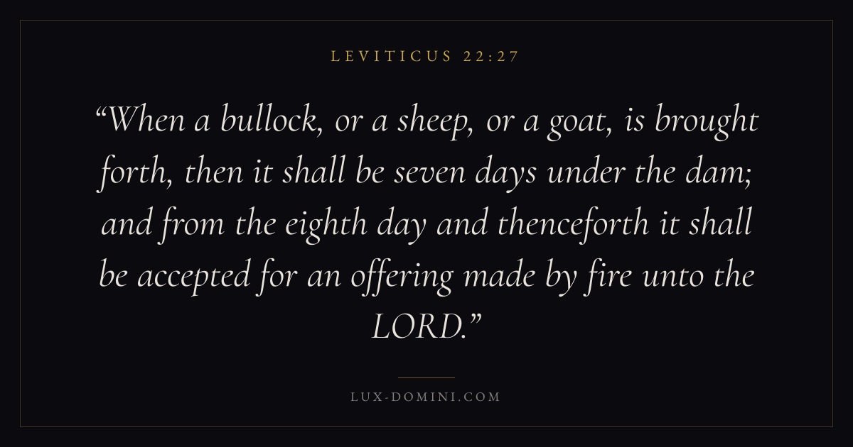 When a bullock, or a sheep, or a goat, is brought forth, then it shall be seven days under the dam; and from the eighth day and thenceforth it shall be accepted for an offering made by fire unto the LORD.