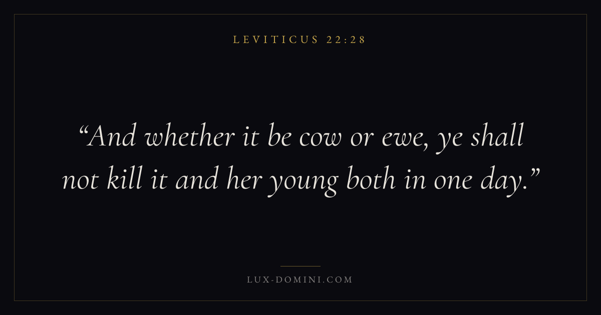 Books / Leviticus / Chapter 22 / Verse 28 ← Leviticus 22:27 Leviticus 22:28 Leviticus 22:29 → And whether it be cow or ewe, ye shall not kill it and her young both in one day. Download verse card Share on Twitter Share on Facebook Pin it ✦ Key themes HolinessAtonementPriesthoodSacrifice Read with Leviticus 22:26Leviticus 22:27 ✦ Leviticus Chapter 22 verses V. 1 V. 2 V. 3 V. 4 V. 5 V. 6 V. 7 V. 8 V. 9 V. 10 V. 11 V. 12 V. 13 V. 14 V. 15 V. 16 V. 17 V. 18 V. 19 V. 20 V. 21 V. 22 V. 23 V. 24 V. 25 V. 26 V. 27 V. 28 V. 29 V. 30 V. 31 V. 32 V. 33