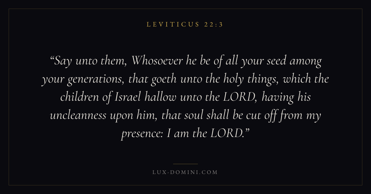 Say unto them, Whosoever he be of all your seed among your generations, that goeth unto the holy things, which the children of Israel hallow unto the LORD, having his uncleanness upon him, that soul shall be cut off from my presence: I am the LORD.