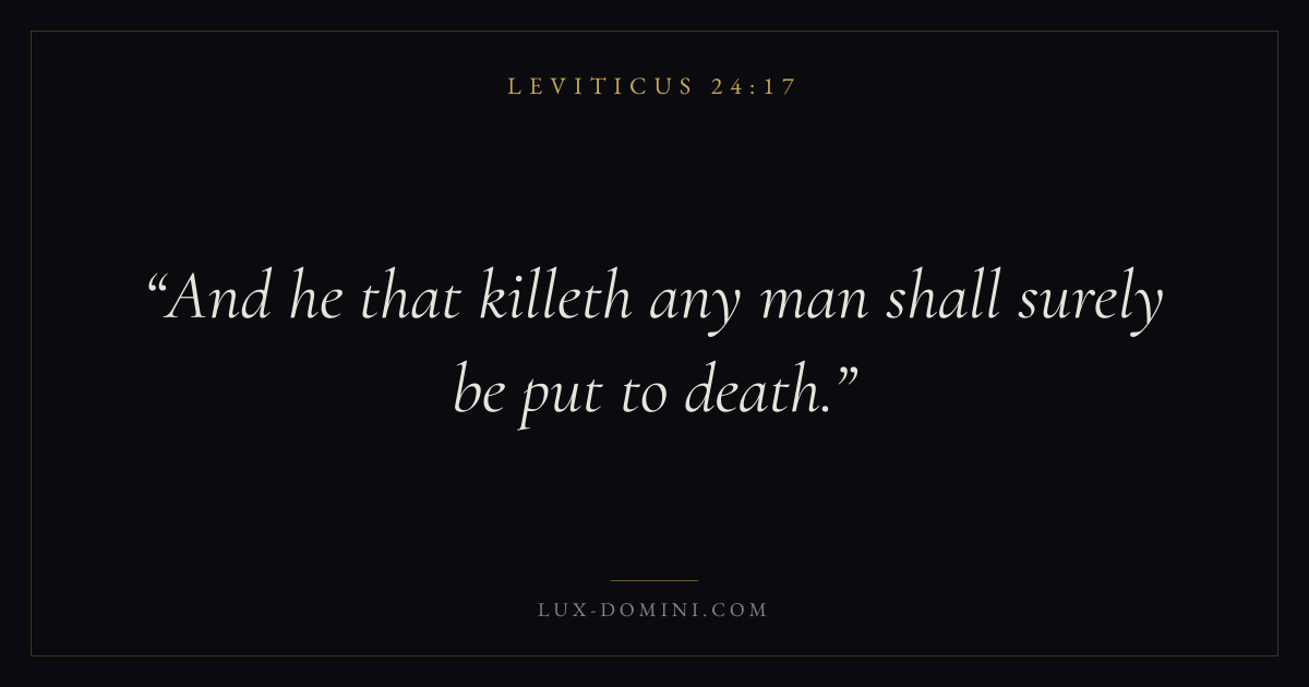 Books / Leviticus / Chapter 24 / Verse 17 ← Leviticus 24:16 Leviticus 24:17 Leviticus 24:18 → And he that killeth any man shall surely be put to death. Download verse card Share on Twitter Share on Facebook Pin it ✦ Key themes HolinessAtonementPriesthoodSacrifice Read with Leviticus 24:18Leviticus 24:19 ✦ Leviticus Chapter 24 verses V. 1 V. 2 V. 3 V. 4 V. 5 V. 6 V. 7 V. 8 V. 9 V. 10 V. 11 V. 12 V. 13 V. 14 V. 15 V. 16 V. 17 V. 18 V. 19 V. 20 V. 21 V. 22 V. 23