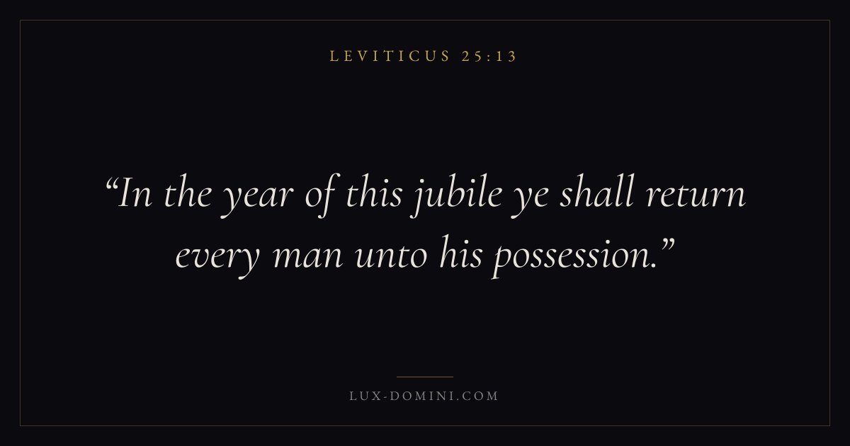 Books / Leviticus / Chapter 25 / Verse 13 ← Leviticus 25:12 Leviticus 25:13 Leviticus 25:14 → In the year of this jubile ye shall return every man unto his possession. Download verse card Share on Twitter Share on Facebook Pin it ✦ Key themes SalvationTruthHolinessAtonement Read with Leviticus 25:14Leviticus 25:15John 3:16Ephesians 2:8 Related topics Bible verses about salvationBible verses about truth ✦ Leviticus Chapter 25 verses V. 1 V. 2 V. 3 V. 4 V. 5 V. 6 V. 7 V. 8 V. 9 V. 10 V. 11 V. 12 V. 13 V. 14 V. 15 V. 16 V. 17 V. 18 V. 19 V. 20 V. 21 V. 22 V. 23 V. 24 V. 25 V. 26 V. 27 V. 28 V. 29 V. 30 V. 31 V. 32 V. 33 V. 34 V. 35 V. 36 V. 37 V. 38 V. 39 V. 40 V. 41 V. 42 V. 43 V. 44 V. 45 V. 46 V. 47 V. 48 V. 49 V. 50 V. 51 V. 52 V. 53 V. 54 V. 55