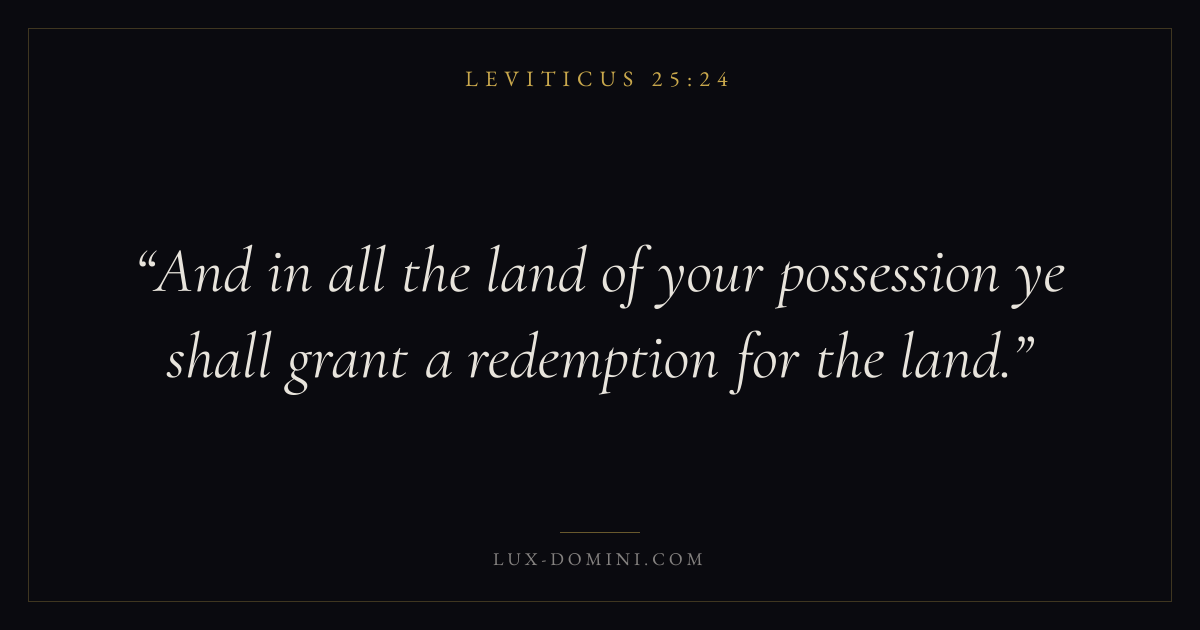 Books / Leviticus / Chapter 25 / Verse 24 ← Leviticus 25:23 Leviticus 25:24 Leviticus 25:25 → And in all the land of your possession ye shall grant a redemption for the land. Download verse card Share on Twitter Share on Facebook Pin it ✦ Key themes SalvationGraceHolinessAtonement Read with Leviticus 25:23John 3:16Ephesians 2:82 Corinthians 12:9 Related topics Bible verses about salvationBible verses about grace ✦ Leviticus Chapter 25 verses V. 1 V. 2 V. 3 V. 4 V. 5 V. 6 V. 7 V. 8 V. 9 V. 10 V. 11 V. 12 V. 13 V. 14 V. 15 V. 16 V. 17 V. 18 V. 19 V. 20 V. 21 V. 22 V. 23 V. 24 V. 25 V. 26 V. 27 V. 28 V. 29 V. 30 V. 31 V. 32 V. 33 V. 34 V. 35 V. 36 V. 37 V. 38 V. 39 V. 40 V. 41 V. 42 V. 43 V. 44 V. 45 V. 46 V. 47 V. 48 V. 49 V. 50 V. 51 V. 52 V. 53 V. 54 V. 55