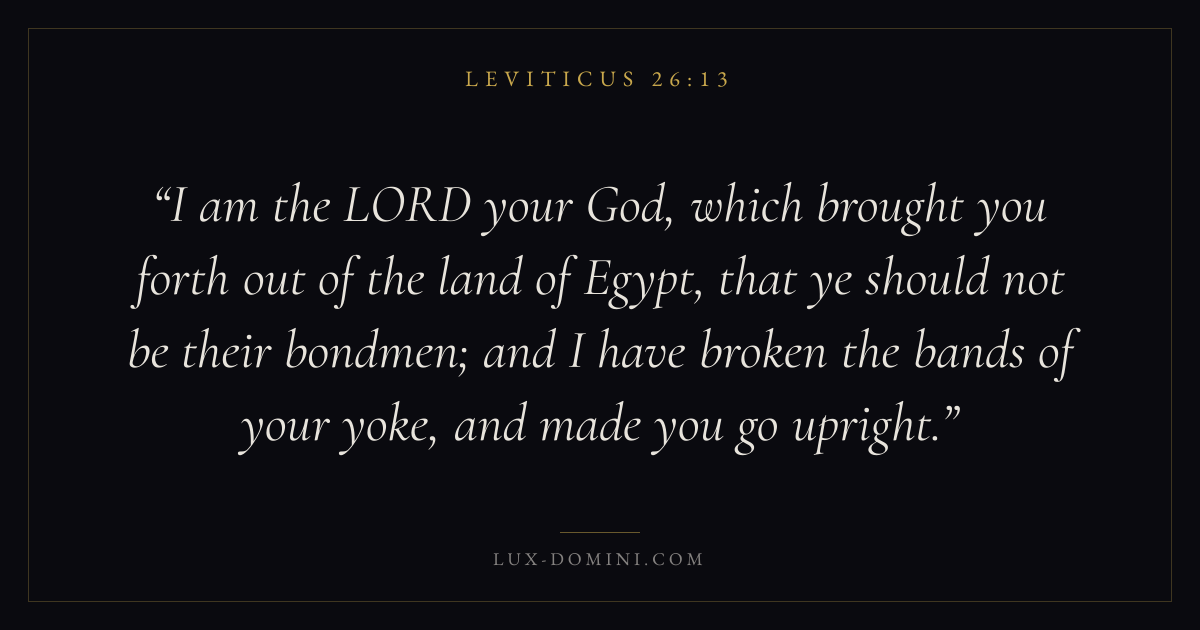 I am the LORD your God, which brought you forth out of the land of Egypt, that ye should not be their bondmen; and I have broken the bands of your yoke, and made you go upright.