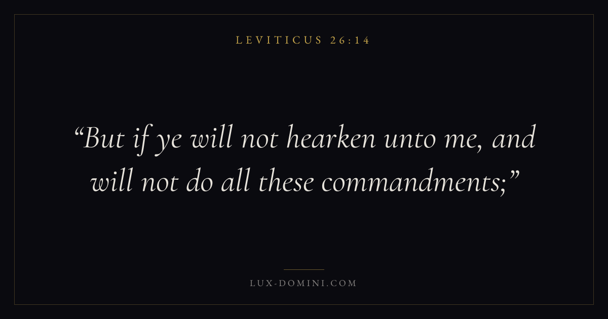 Books / Leviticus / Chapter 26 / Verse 14 ← Leviticus 26:13 Leviticus 26:14 Leviticus 26:15 → But if ye will not hearken unto me, and will not do all these commandments; Download verse card Share on Twitter Share on Facebook Pin it ✦ Key themes HolinessAtonementPriesthoodSacrifice Read with Leviticus 26:15Leviticus 26:16 ✦ Leviticus Chapter 26 verses V. 1 V. 2 V. 3 V. 4 V. 5 V. 6 V. 7 V. 8 V. 9 V. 10 V. 11 V. 12 V. 13 V. 14 V. 15 V. 16 V. 17 V. 18 V. 19 V. 20 V. 21 V. 22 V. 23 V. 24 V. 25 V. 26 V. 27 V. 28 V. 29 V. 30 V. 31 V. 32 V. 33 V. 34 V. 35 V. 36 V. 37 V. 38 V. 39 V. 40 V. 41 V. 42 V. 43 V. 44 V. 45 V. 46