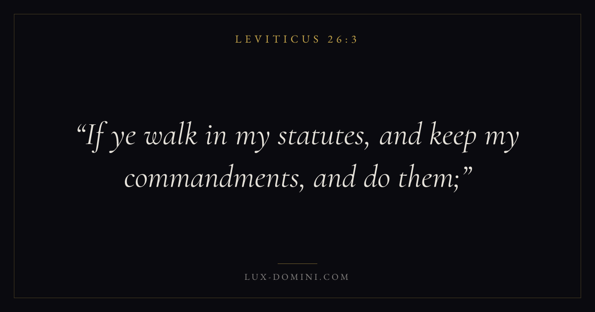 Books / Leviticus / Chapter 26 / Verse 3 ← Leviticus 26:2 Leviticus 26:3 Leviticus 26:4 → If ye walk in my statutes, and keep my commandments, and do them; Download verse card Share on Twitter Share on Facebook Pin it ✦ Key themes HolinessAtonementPriesthoodSacrifice Read with Leviticus 26:4Leviticus 26:5 ✦ Leviticus Chapter 26 verses V. 1 V. 2 V. 3 V. 4 V. 5 V. 6 V. 7 V. 8 V. 9 V. 10 V. 11 V. 12 V. 13 V. 14 V. 15 V. 16 V. 17 V. 18 V. 19 V. 20 V. 21 V. 22 V. 23 V. 24 V. 25 V. 26 V. 27 V. 28 V. 29 V. 30 V. 31 V. 32 V. 33 V. 34 V. 35 V. 36 V. 37 V. 38 V. 39 V. 40 V. 41 V. 42 V. 43 V. 44 V. 45 V. 46
