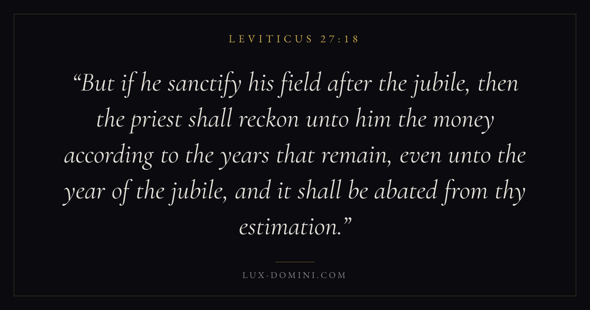 But if he sanctify his field after the jubile, then the priest shall reckon unto him the money according to the years that remain, even unto the year of the jubile, and it shall be abated from thy estimation.