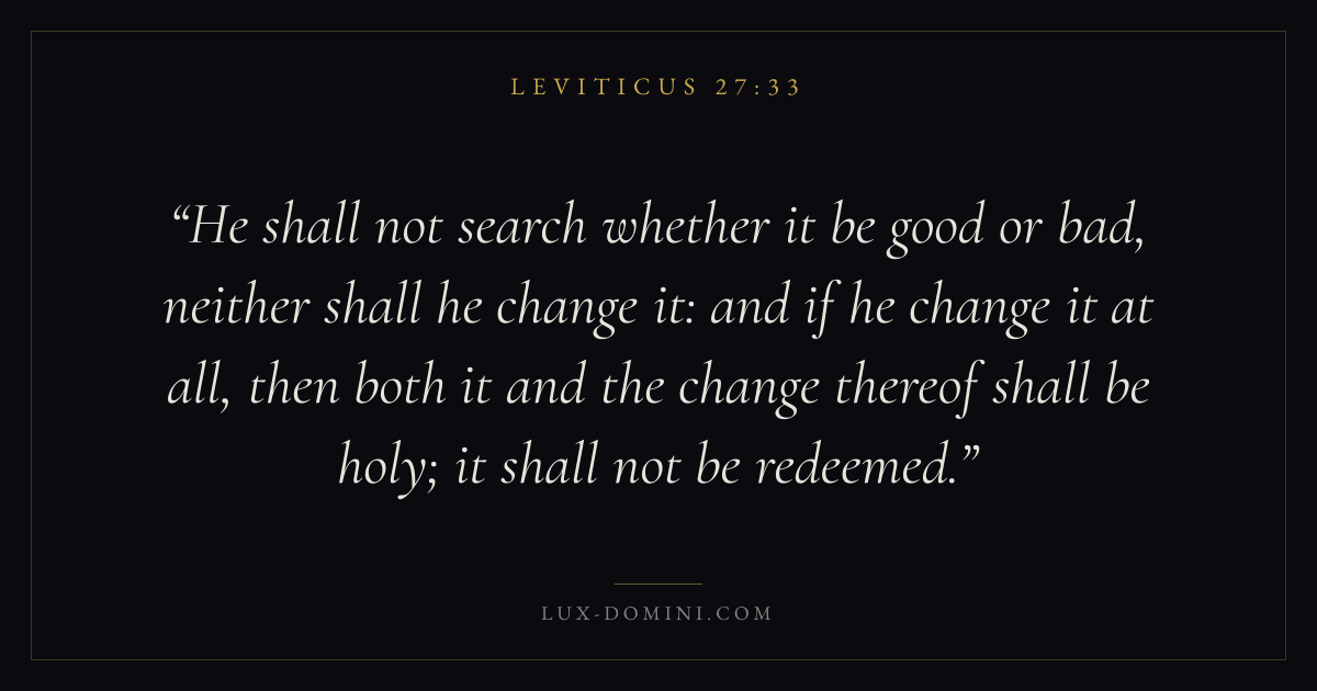 He shall not search whether it be good or bad, neither shall he change it: and if he change it at all, then both it and the change thereof shall be holy; it shall not be redeemed.