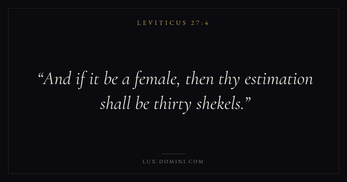 Books / Leviticus / Chapter 27 / Verse 4 ← Leviticus 27:3 Leviticus 27:4 Leviticus 27:5 → And if it be a female, then thy estimation shall be thirty shekels. Download verse card Share on Twitter Share on Facebook Pin it ✦ Key themes SalvationHolinessAtonementPriesthood Read with Leviticus 27:1Leviticus 27:2John 3:16Ephesians 2:8 Related topics Bible verses about salvation ✦ Leviticus Chapter 27 verses V. 1 V. 2 V. 3 V. 4 V. 5 V. 6 V. 7 V. 8 V. 9 V. 10 V. 11 V. 12 V. 13 V. 14 V. 15 V. 16 V. 17 V. 18 V. 19 V. 20 V. 21 V. 22 V. 23 V. 24 V. 25 V. 26 V. 27 V. 28 V. 29 V. 30 V. 31 V. 32 V. 33 V. 34
