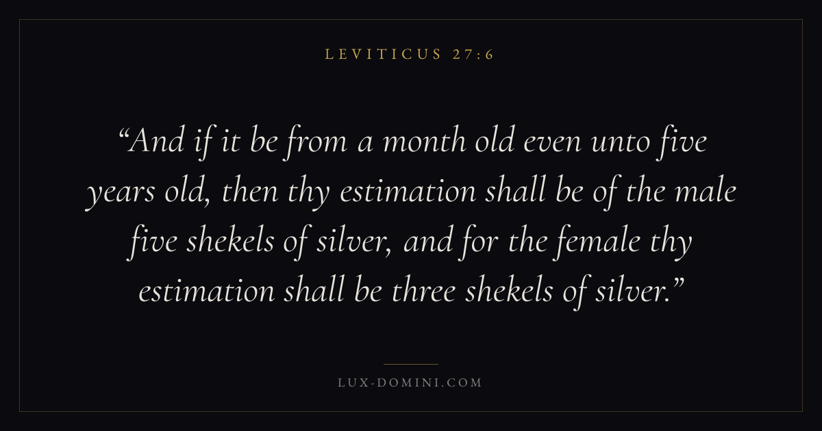And if it be from a month old even unto five years old, then thy estimation shall be of the male five shekels of silver, and for the female thy estimation shall be three shekels of silver.