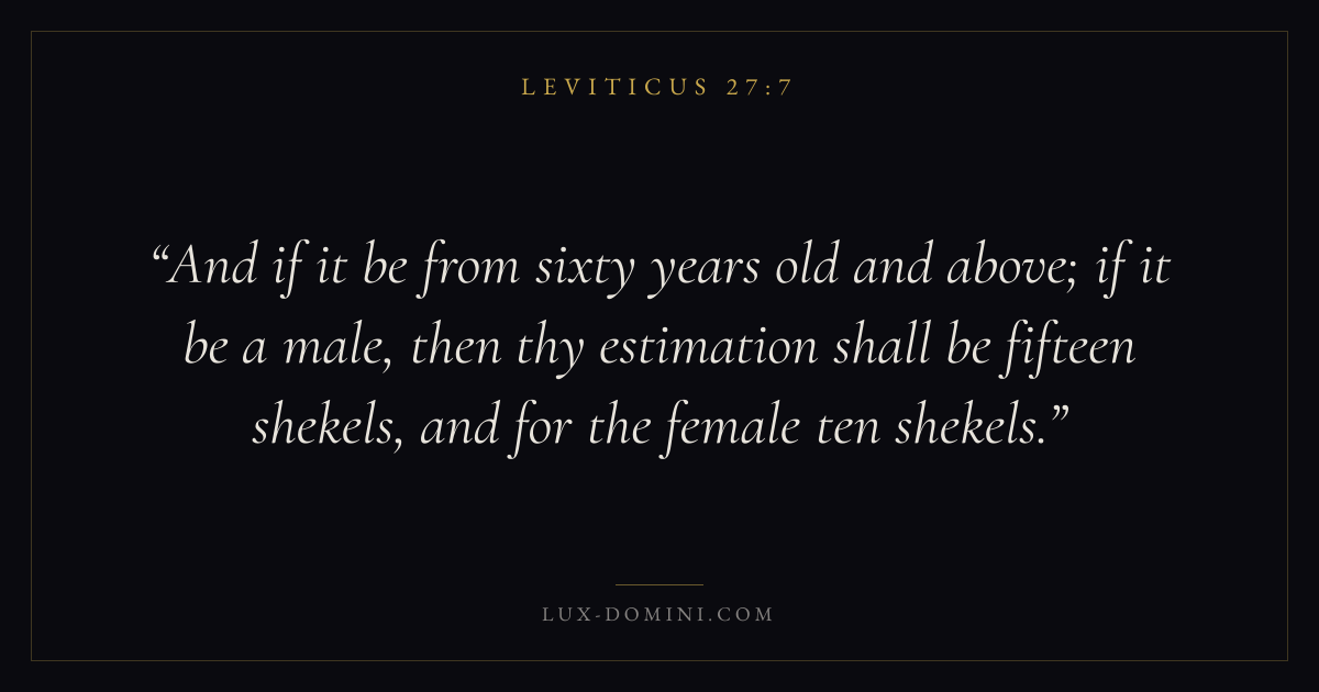And if it be from sixty years old and above; if it be a male, then thy estimation shall be fifteen shekels, and for the female ten shekels.
