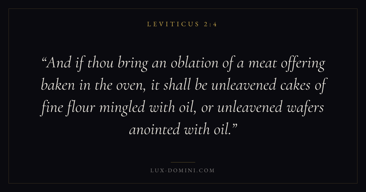 And if thou bring an oblation of a meat offering baken in the oven, it shall be unleavened cakes of fine flour mingled with oil, or unleavened wafers anointed with oil.