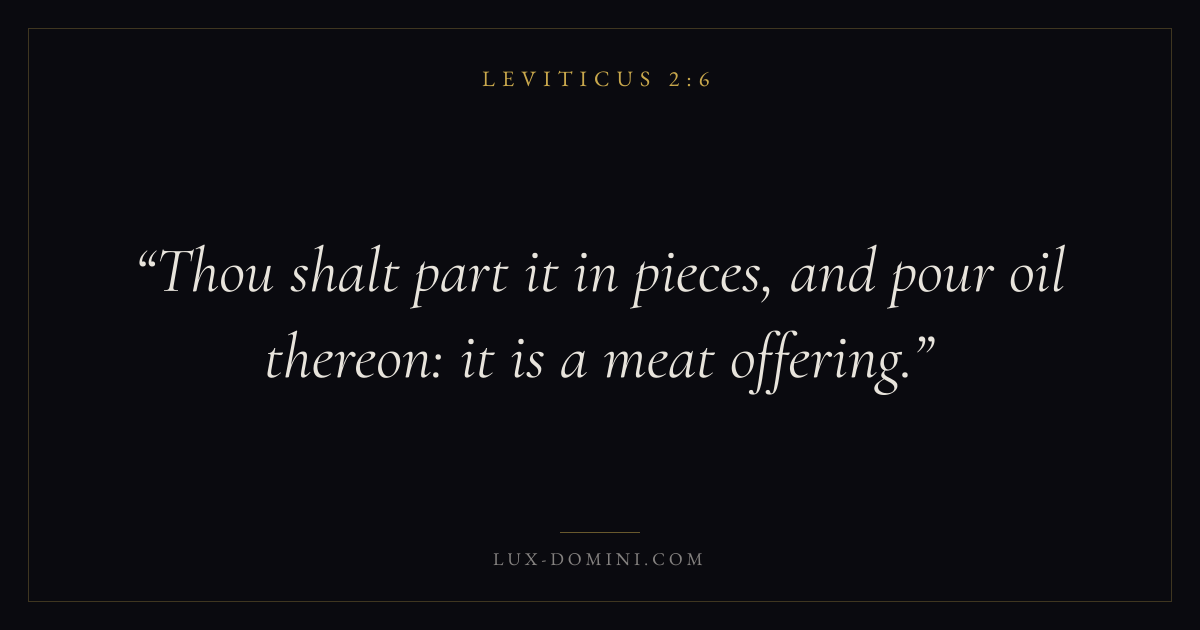 Books / Leviticus / Chapter 2 / Verse 6 ← Leviticus 2:5 Leviticus 2:6 Leviticus 2:7 → Thou shalt part it in pieces, and pour oil thereon: it is a meat offering. Download verse card Share on Twitter Share on Facebook Pin it ✦ Key themes HolinessAtonementPriesthoodSacrifice Read with Leviticus 2:5 ✦ Leviticus Chapter 2 verses V. 1 V. 2 V. 3 V. 4 V. 5 V. 6 V. 7 V. 8 V. 9 V. 10 V. 11 V. 12 V. 13 V. 14 V. 15 V. 16