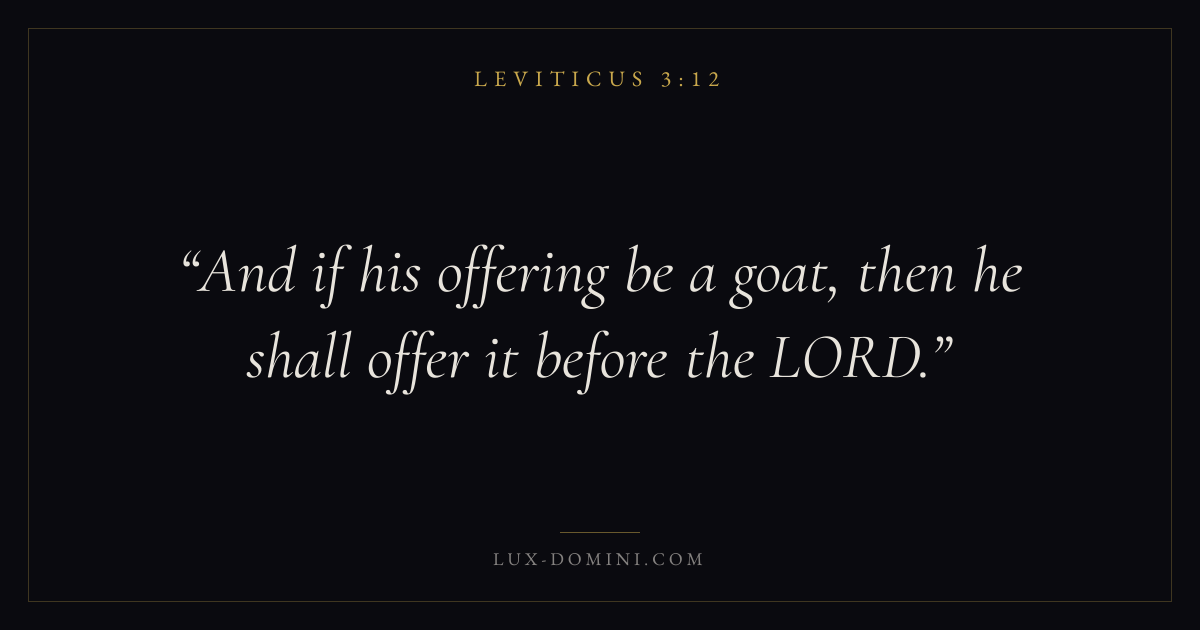 Books / Leviticus / Chapter 3 / Verse 12 ← Leviticus 3:11 Leviticus 3:12 Leviticus 3:13 → And if his offering be a goat, then he shall offer it before the LORD. Download verse card Share on Twitter Share on Facebook Pin it ✦ Key themes HolinessAtonementPriesthoodSacrifice Read with Leviticus 3:13Leviticus 3:14 ✦ Leviticus Chapter 3 verses V. 1 V. 2 V. 3 V. 4 V. 5 V. 6 V. 7 V. 8 V. 9 V. 10 V. 11 V. 12 V. 13 V. 14 V. 15 V. 16 V. 17