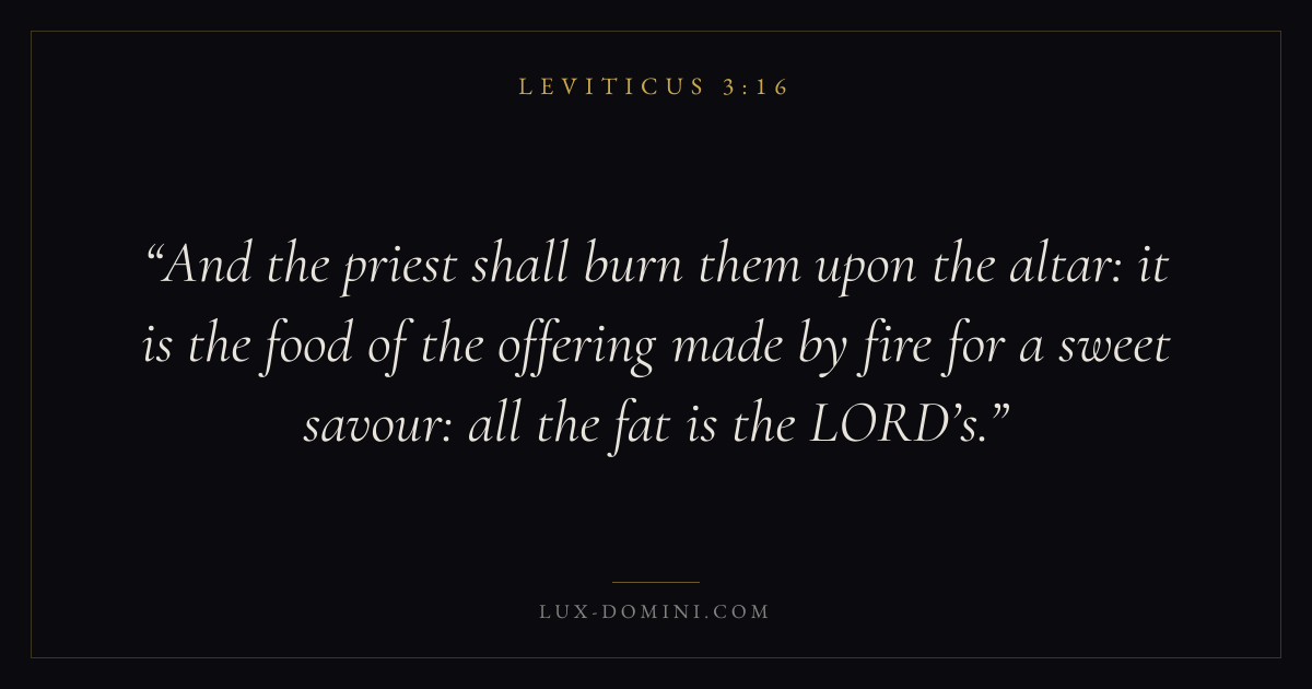 And the priest shall burn them upon the altar: it is the food of the offering made by fire for a sweet savour: all the fat is the LORD’s.